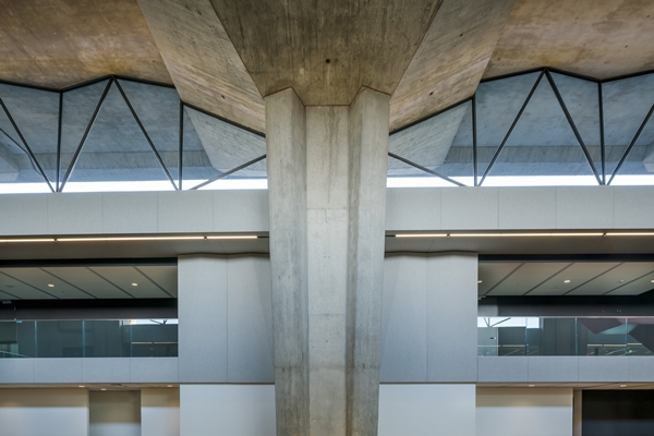 Door het deels verwijderen van de verdiepingsvloer in de hal is ook de bijzondere gefacetteerde betonnen onderzijde van de tafelconstructie beter te ervaren. Tussen de laagbouw en de betonconstructie van de hoogbouw bevinden zich driehoekige ramen. Deze gefacetteerde en driehoekige vormen heeft Team V laten terugkomen op verschillende plekken, zoals in de nieuwe gevelbekleding van de laagbouw en de vilten akoestische wandbekleding in de hal en in collegezalen.