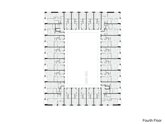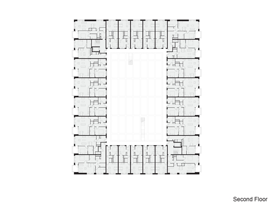 . Hun toegangscorridor loopt langs en ziet uit op de centrale evenementenhal. Alle appartementen met uitzicht op de binnenstraten hebben een eigen, half inpandig balkon.