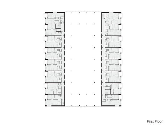 Op de eerste verdieping bevinden zich twee stroken met acht woningen van ongeveer 50 m