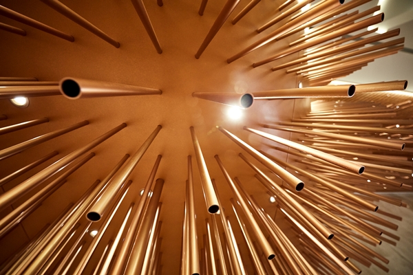 “De horizontale delen van de Chandelier zijn gemaakt van driedimensionaal gevormde schuimpanelen, afgewerkt met een koperkleurige polyurethaan coating en voorzien van bijna vijfduizend koperkleurige pijpjes van verschillende lengten. Door de gaten voor deze pijpjes CNC-gestuurd te boren werd de haaksheid gegarandeerd”, zegt verantwoordelijk ingenieur Sander de Kip.