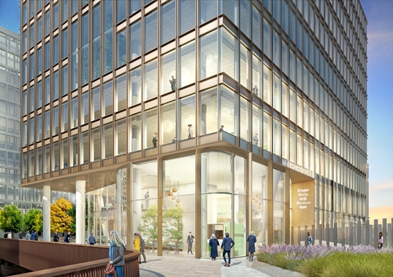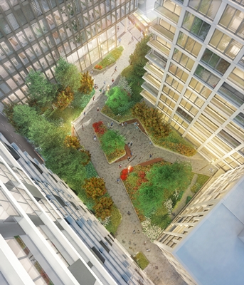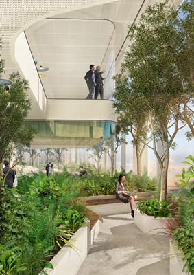 De bouwmassa van de door GROUP A ontworpen kantoortoren wordt op een hoogte van 45 m in tweeën gedeeld met een sculpturale doorsnijding, die ruimte maakt voor een dubbelhoge binnentuin. Dit wordt de plek waar de gebruikers van het gebouw elkaar kunnen ontmoeten en kunnen genieten van een breed uitzicht over de stad.