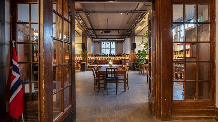 Vos heeft – in co-creatie met Artisan Tech AS – het interieur ontwikkeld. Vrijstaande boekenkasten zijn verwijderd; in plaats daarvan is gekozen voor de traditionele boekenkasten langs de wanden.