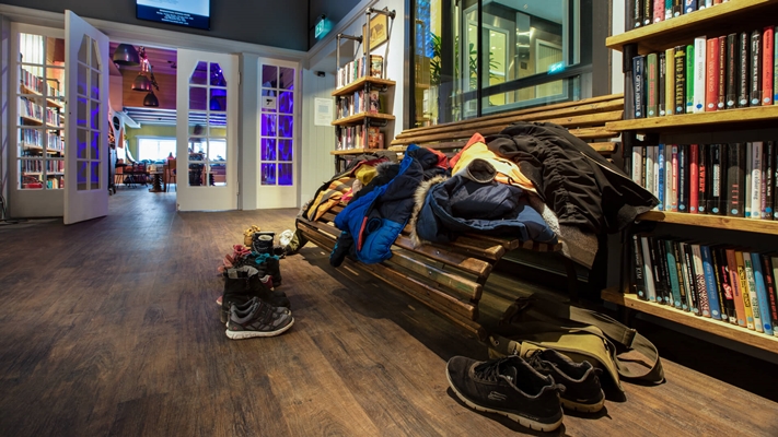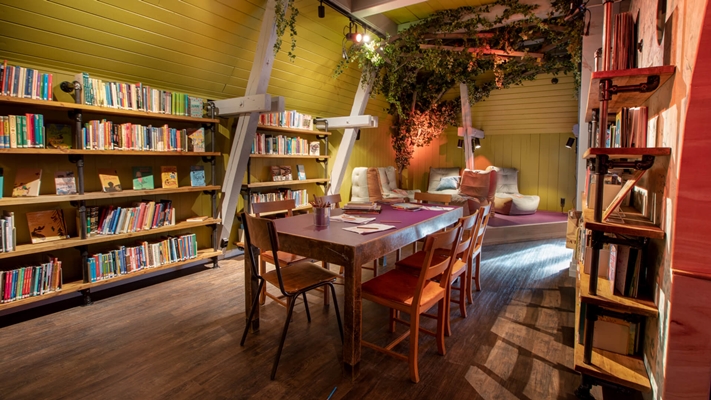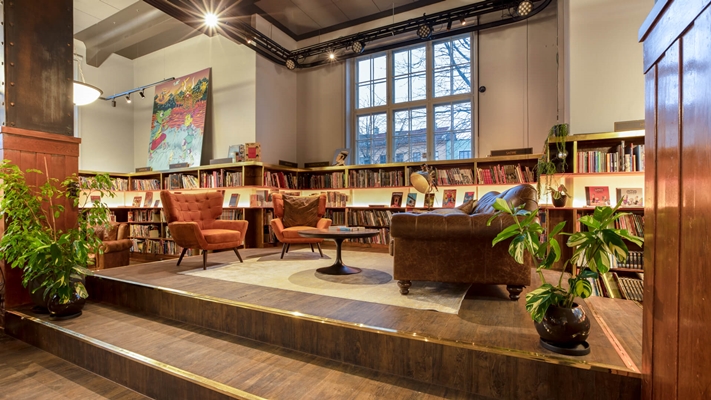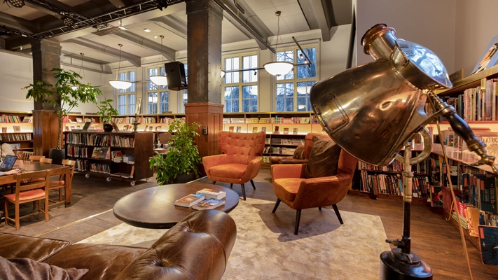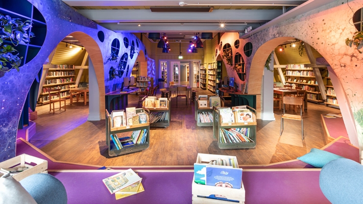 Sfeervolle stadsdeelbibliotheek in oude supermarkt
