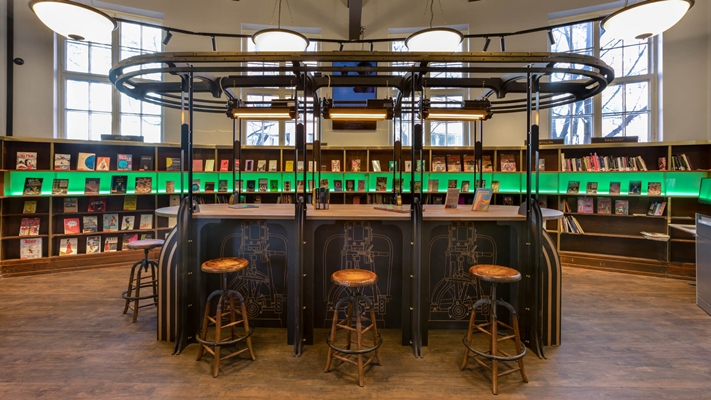 Verlichting is in de kasten geïntegreerd. De planken zijn opgetild en een verlichte plank is toegevoegd, waarmee bijzondere items in de schappen worden ‘uitgelicht’. De kleur van de verlichting kan daarbij worden gewijzigd om bijvoorbeeld met het oog op evenementen een andere sfeer te creëren.