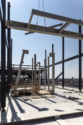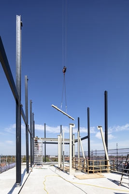 Op het dak van het Molengebouw en Riffellokaal in Leiden is afgelopen week de stalen constructie voor een nieuw penthouse verrezen. De constructie markeert een bijzonder moment binnen het herontwikkelingsproject De Meelfabriek.