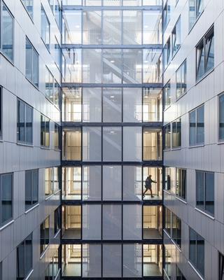 . Door het hart van het pand loopt een straat die aansluit op het stratenplan van de campus en licht en lucht naar binnen brengt.