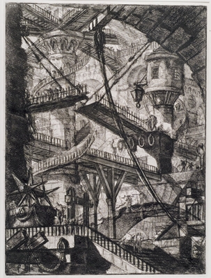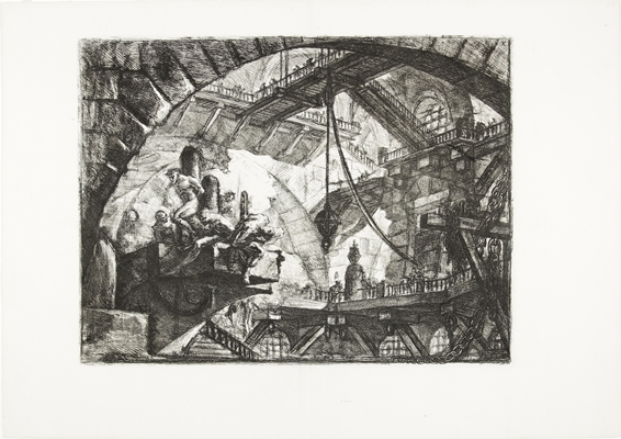 Piranesi’s wereldberoemde serie Carceri d’ Invenzione (Imaginaire kerkers, 1749-1750) laat schaduwwerelden zien die eindeloos buiten het papier door lijken te gaan, en waar het oog blijft dwalen over trappen, bruggen, galerijen en loopplanken. Hij schept hier een onderwereld van onheilspellende spelonken, en de kleine figuren die hij aan deze ruimten toevoegt - soms rustig wandelend dan weer heftig gebarend - verraden hoe nietig de mens is.