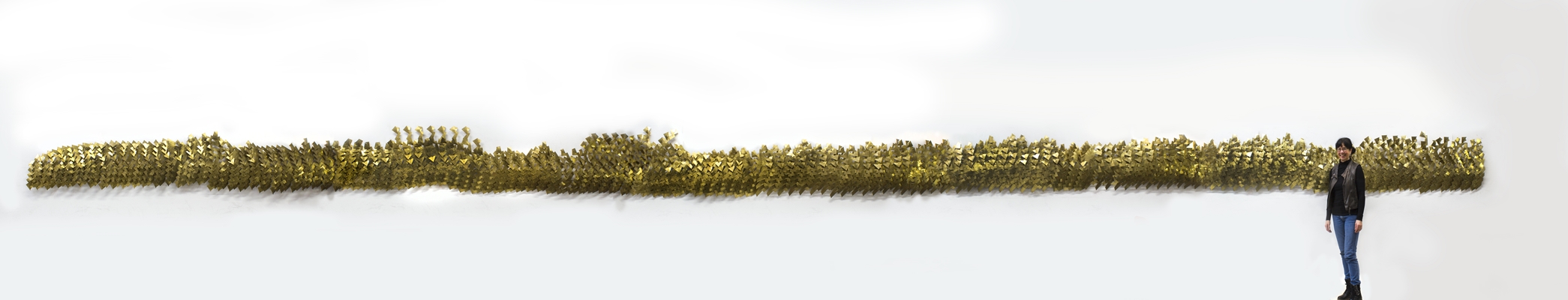 Deze ‘minimal music’ heeft ze omgezet in een ruimtelijk object, dat is opgebouwd uit kleine, herhaalde motieven. De motieven zijn twee verschillende, handgemaakte messing vormen, die in elkaar kunnen worden geschoven. Door vele tientallen ‘motieven’ te combineren – te herhalen en te variëren – heeft Hordijk een twintig meter lang sculptuur gemaakt.