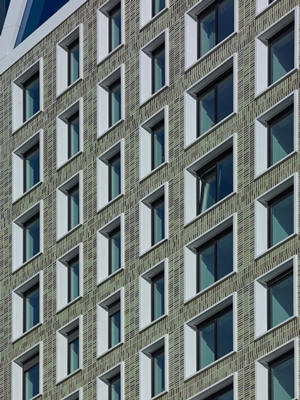 In de gevel is de huid van geglazuurd baksteen als een continu grid over de hoofdvorm gelegd. Buitenruimtes liggen binnen deze schil om windluwe balkons te creëren. Dankzij het speciale glazuur komen er zes verschillende tinten steen in het gebouw voor. Op die manier kleur het gebouw mee met het weer en het water van het IJ.