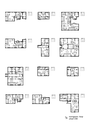 In de lage U van het gebouw en de torenpoten liggen de huurwoningen. In het bruggedeelte bevinden zich uitsluitend koopwoningen. Hier is bijna iedere woning uniek door een zeer vergaande keuzevrijheid voor de kopers in grootte en inrichting, aldus Arons en Gelauff.