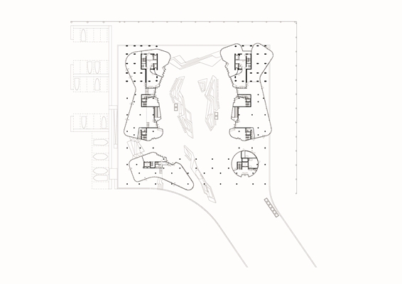 Het gebouw is zeven meter opgetild, waardoor het plein binnen het volume goed toegankelijk is en er veel zicht op de omgeving ontstaat. Bovendien geven de openingen het gebouw een lichtvoetiger karakter. Onder de robuuste hoofdvorm liggen ‘zachter’ vormgegeven paviljoens met de entrees en verschillende stedelijke functies. Het plein is in dialoog met de paviljoens ontworpen door