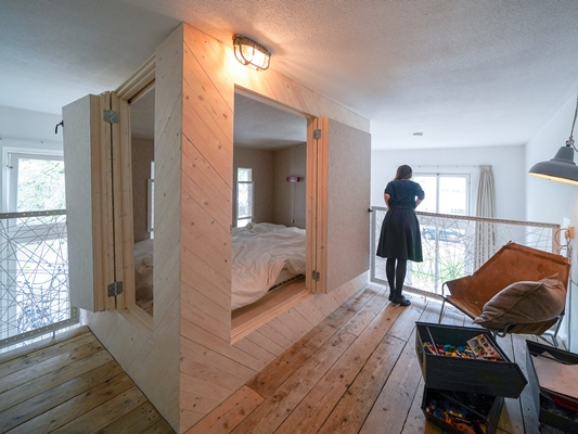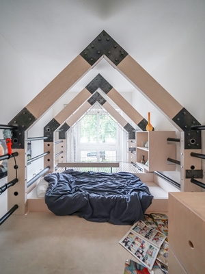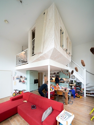 mocht de bijbehorende ruimtelijke oplossing bedenken, met als onderliggende ontwerpvragen van de opdrachtgevers: Kunnen we een meer besloten slaapplek voor de ouders op de entresol èn een slaapverdieping in de kinderkamer van nog geen negen vierkante meter maken? Het antwoord van de architecten was een ‘sleeping pod’ op de entresolvloer voor de ouders en een slaapkamer-met-klimrek voor de drie zoons.