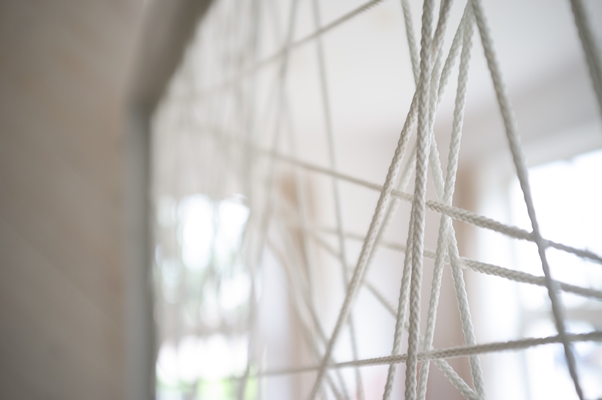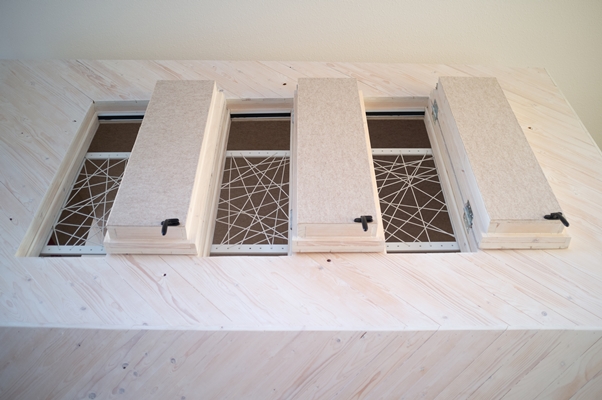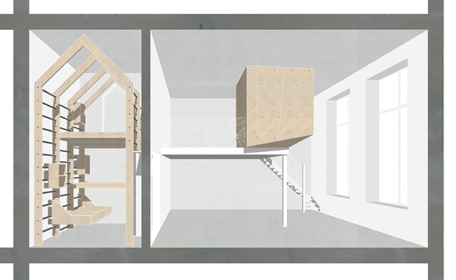 Houten bakjes, kleine kastjes en de netten kunnen op verschillende plekken in het rek worden gehangen. Een kleine deur geeft vanuit de badkamer toegang tot het hogere gedeelte. Het flexibele systeem wordt intensief gebruikt en is inmiddels uitgebreid met een aankleedplank en boksbal, aldus het betrokken architectenbureau.