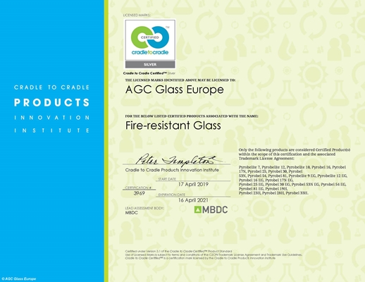 AGC Glass Europe meldt dat aan twee productlijnen van haar brandwerend glas het Cradle to Cradle Silver-certificaat is toegekend. De certificering toont aan dat “AGC haar streven naar duurzame glasproducten blijft waarmaken”, aldus de onderneming.
