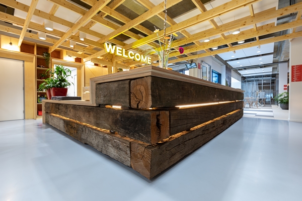 De ondergrondse laag, de begane grond en de eerste verdieping vormen samen de ‘publieke’ zone van het gebouw, legt Studio Valkenier uit. De balie, gemaakt van hergebruikte meerpalen, is het fysieke en sociale hart van de organisatie.
