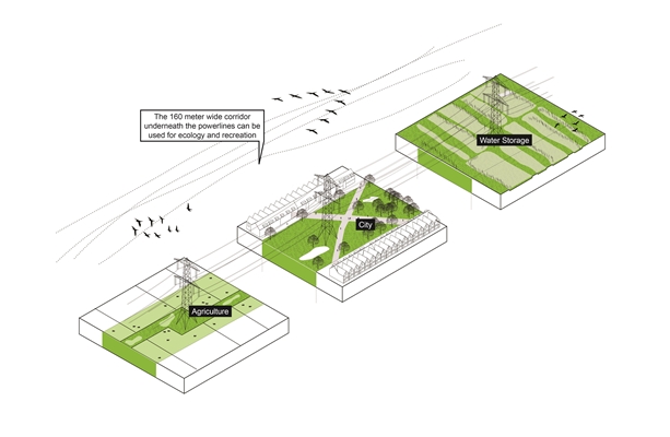 Ten tweede zou de energie-infrastructuur, wanneer mogelijk, moeten worden gecombineerd met andere functies, zoals ecotoerisme, mobiliteit, circulaire economie en ecologie. “In plaats van een invasieve en verstorende aanwezigheid in het landschap, zou energieproductie een aantrekkelijke infrastructuur moeten zijn, die het gebied activeert met nieuwe esthetische en ruimtelijke kwaliteiten”, schrijft het ontwerpbureau.