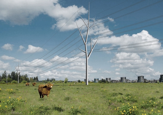 Concept visualisatie van boom-achtige hoogspanningsmasten, om iconische waarde te geven aan het Ecologische Energie Netwerk