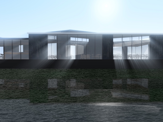 Van buitenaf oogt het gebouw anders vanuit verschillende gezichtspunten, met enerzijds transparantie en openheid, anderzijds een massief en gesloten beeld. Het materiaalgebruik sluit aan bij de context van de werf; de constructie van het paviljoen wordt opgetrokken uit staal.