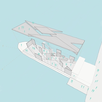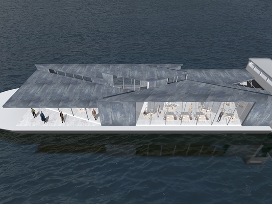 om een drijvend restaurant te realiseren in het NDSM-gebied. Architect Javier Zubiria heeft het paviljoen ontworpen als een kunstwerk dat door een schip wordt vervoerd.