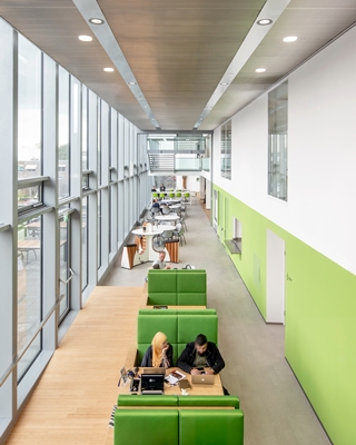 Waar de rustige werkplekken aan één gevel van het gebouw liggen, bevinden de samenwerkings- en ontmoetingsplekken zich aan de andere zijde langs een hoge open vide. Op de eerste verdieping ligt aan deze vide ook het restaurant. Dit heeft een buitenterras op het dak van de voormalige bedrijfshal waarin nu de archieven van het Regionaal Historisch Centrum zijn opgenomen. Het publieksplein met de loketten ligt centraal op de begane grond.