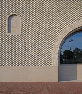 Met zijn opvallende verschijning aan de Lammermarkt verhoudt het museum zich tot het nieuwe plein hier, de molen die eraan ligt, maar ook tot de verderop gelegen hogere bebouwing rond het stationsgebied, zoals de woontorens die Neutelings Riedijk Architecten daar ontworpen heeft. “Het is een gebouw dat brutaal zijn plek inneemt”, bevestigt Happel. “Maar ook een gebouw dat, als je het benadert, interessant blijft door een zorgvuldige detaillering en stapeling van bouwelementen.”