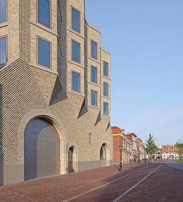 “Het kleur van het metselwerk van de nieuwbouw hebben we afgestemd op de kleur van de oude zandstenen gevel”, vertelt architect Ninke Happel, die het hele proces samen met bureaupartners Floris Cornelisse en Paul Verhoeven doorlopen heeft. “Met de keuze voor metselwerk leggen we ook bewust de verbinding met het metselwerk van de Lakenhal, maar we hebben dan wel weer gekozen voor een dubbel gebakken steen, wat in de zeventiende eeuw nog niet bestond.”