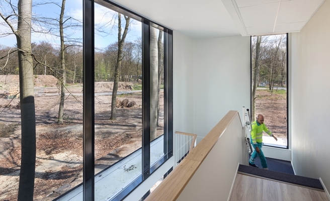De verschillende bouwhoogten, grote ramen, terrassen en balkons geven het gebouw de uitstraling van een Hilversumse villa, meldt Wiegerinck. Donkere leistenen en een houten gevel moeten de post op een subtiele wijze inpassen in het bos. Ook het interieur sluit aan op de omgeving, mede dankzij de toepassing van materialen met een natuurlijke uitstraling.