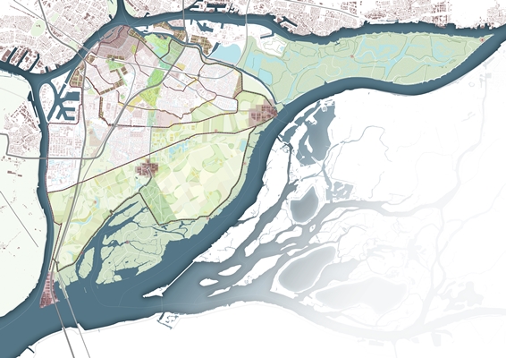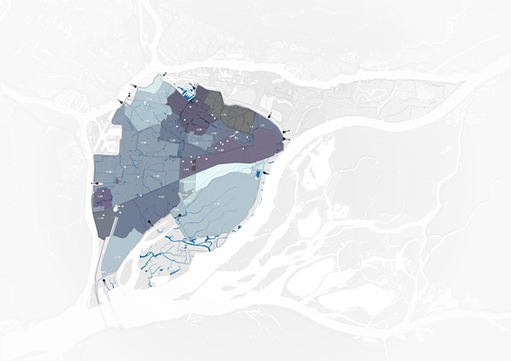De ontwikkeling van Dordrecht tot een klimaatadaptief eiland heeft het bureau verkend aan de hand van vier thema’s met individuele agenda’s: water, groen, programma en infrastructuur. Voor elk thema zijn de verschillende agenda’s geprojecteerd op de historische structuur van de dijken, legt Felixx uit.