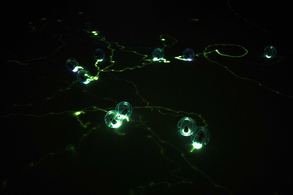 Naast dit spel van licht en schaduw, die vier zalen in beslag neemt, zijn er ook twee zalen met een ander thema. In een zaal kun je met elkaar slingerende lijnen op de vloer tekenen, door de transparante bollen in beweging te brengen. De lichttekeningen roepen bij Roosegaarde zelf herinneringen op aan primitieve grottekeningen. Het heeft ook wel iets van glinsteringen van water.
