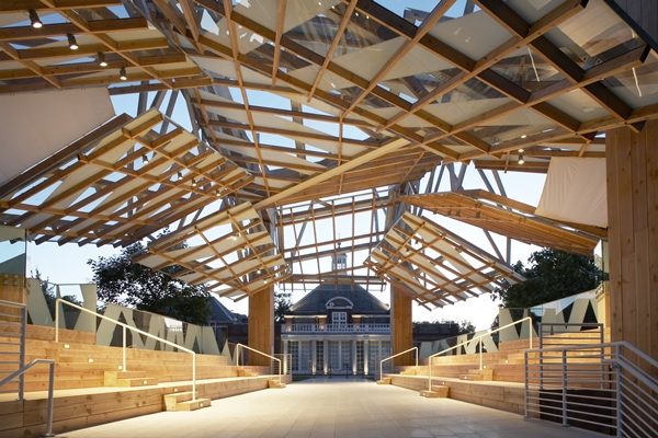 combineerde een wandeldek met tribunes. Vier met hout beklede stalen kolommen droegen een groot aantal houten balken; “echt enorm zware stukken hout”, vertelde Peyton-Jones later. De – deels glazen – panelen, die schots en scheef in de constructie leken gestoken waren een ontwerpidee van Gehry’s zoon Samuel.