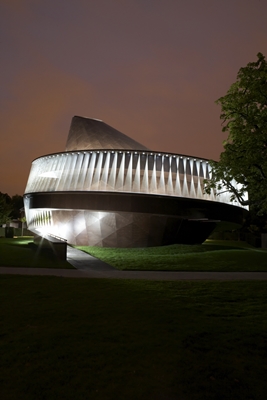in het park, met felrode kleur, geometrische vormen en dramatische overstekken uit metaal. Raamwerken met glas en lichtgewicht materialen als polycarbonaat en textiel creëerden veelzijdige binnen- en buitenruimten; het flexibele auditorium was aanpasbaar aan weersomstandigheden en aantallen bezoekers.