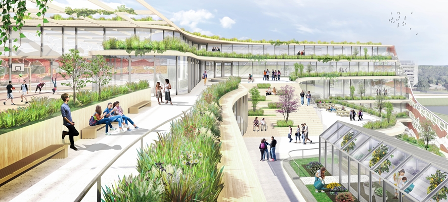 “Wij stellen verschillende sferen voor: Urban voor de oudere kinderen en natuurlijk voor de jongsten, met sport als verbinding. Dit wordt uitgewerkt in verschillende tuinen en pleinen met dezelfde vloeiende lijnen als het gebouw, begrensd door hagen, randen en hoogteverschillen”, meldt Team SVP en CROSS.