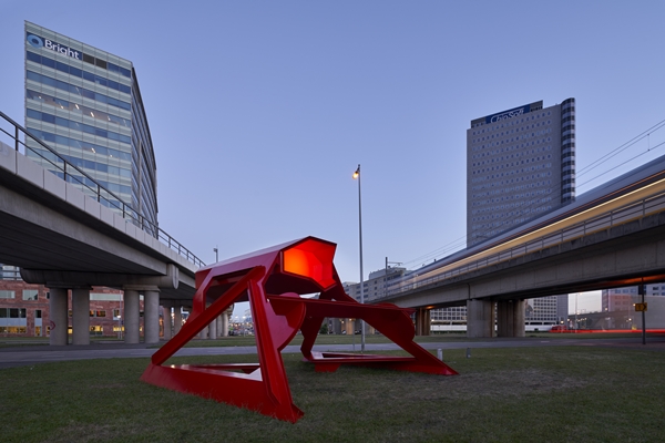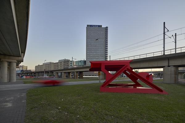 Midden in het kantorengebied en het infrastructurele knooppunt van Amsterdam Sloterdijk staat een installatie van kunstenaar-ontwerper