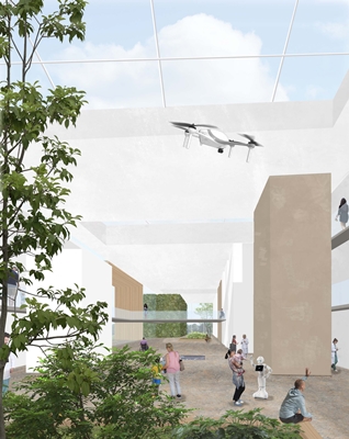 Drager, afbouw en inbouw zijn drie onafhankelijke lagen, ontworpen op hergebruik, demontabel en bio-based. Een groot deel van de draagstructuur bestaat uit drie-dimensionale casco’s, die eenvoudig uitgewisseld kunnen worden in het eigen ziekenhuis maar ook later voor woningbouw op een andere locatie zijn toe te passen.