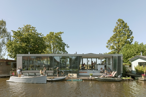 een woonark ontworpen. Doordat de ark aan de overkant van de vaart ligt en enkel toegankelijk is met een veerpontje, konden beide lange zijden van het bouwwerk bijna volledig open worden gemaakt.