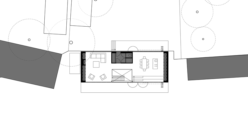 Beide kopgevels zijn gesloten en kaderen ze de uitzichten over het oer-Hollandse landschap in. De plattegrond is in drie zones verdeeld: de woonkamer, het entreeblok met vide en de keuken. De keuken staat via een ruimte trap in verbinding met de vlonder. Als de grote harmonicapuien worden opengeschoven, ontstaat er een open tribune van zes bij drie meter aan het water.