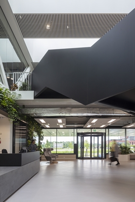 Een ruim en transparant atrium dat baadt in noordelijk licht vormt het hart van het kantoorgebouw. De centrale ruimte is voorzien van levend groen langs de wanden en in borders die van binnen naar buiten doorlopen.