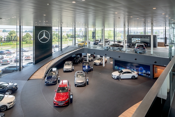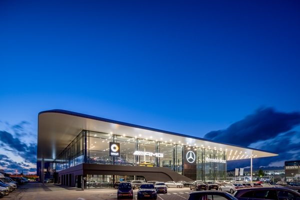 Royale dakrand en etalage met auto's voor flagshipstore Mercedes