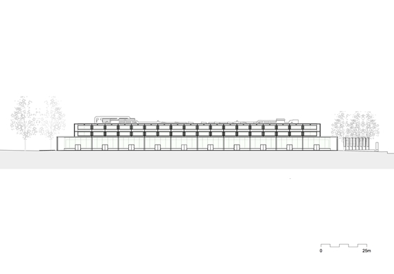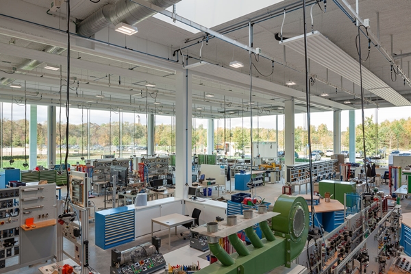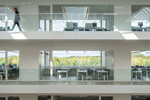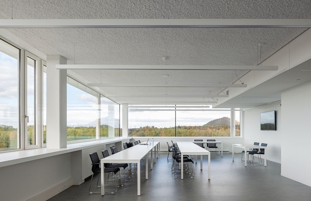 Door de glazen ramen van de klaslokalen en de productiehallen is er duidelijk zicht op de activiteiten in deze ruimtes en kan men vanuit bijna iedere punt een blik werpen op het omgevende landschap, ondanks de diepte van meer dan 90 meter aan de korte kant van het gebouw, aldus de architecten.