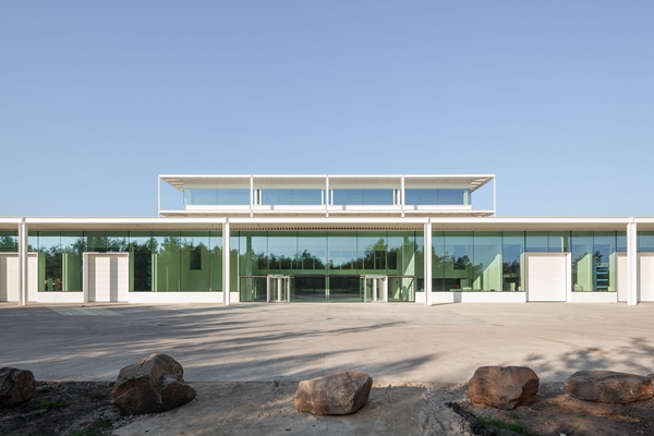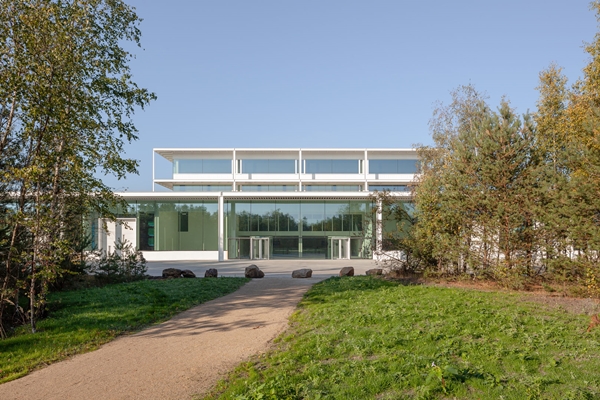 Een witte stalen colonnade omsluit het complete gebouw en functioneert, zo leggen de architecten uit, als formeel en technisch filter tussen landschap en gebouw. De kleur wit is gekozen om het contrast te verscherpen tussen de geometrische architectuur en de zachte vormen en kleuren van de omliggende bomen en het parklandschap.
