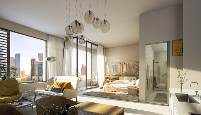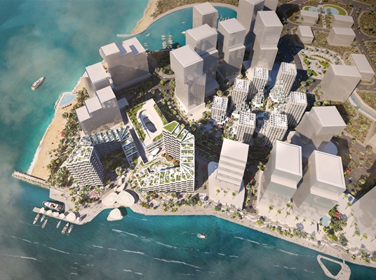 met appartementen, winkels, kantoren en voorzieningen. Het gemengde programma is ondergebracht in zeven torens rond een gemeenschappelijk plein, wat volgens de architecten een ongebruikelijke benadering in de Emiraten is.