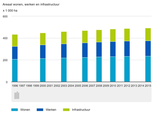 Tussen 1996 en 2015 is het oppervlak aan grondgebied voor wonen, werken en infrastructuur toegenomen van 433,4 duizend hectare naar 492,6 duizend ha. Bestond in 1996 dertien procent van het Nederlands grondgebied uit dit soort terrein, twintig jaar later was dat 14,6 procent.