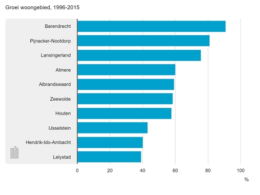 De impact van Vinex was nog groter in randgemeenten, aldus het CBS. Zo groeide het woongebied in Barendrecht in de periode 1996-2015 met 91 procent. In Pijnacker-Nootdorp bedroeg de toename 81 procent, in Lansingerland 76 procent.