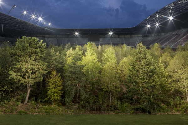 Het veld van een voetbalstadion in het Oostenrijkse Klagenfurt is omgeturnd tot een bos met bijna driehonderd bomen. De installatie