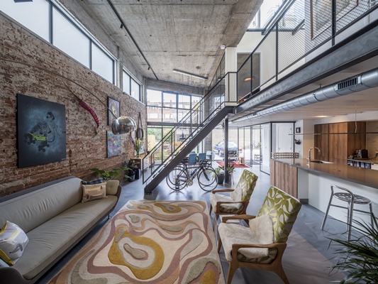 De woningen zijn aan die zijde voorzien van grote puien met een ranke detaillering, conform de stalen bovenlichten die al aan vier zijden van de zaal zaten. Beide lofts hebben in de hoge, open ruimte een entresol met slaapkamers gekregen.