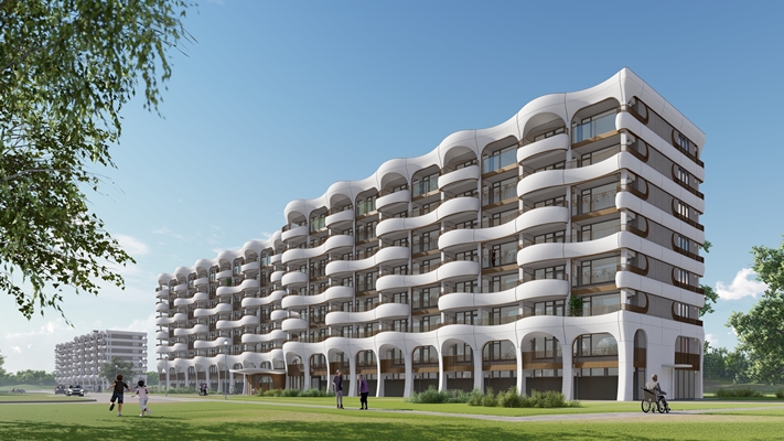 golvende balkons die de grauwe en monotone flats veranderen in organisch ogende gebouwen. De balkons worden ge-3D-print in een fabriek van Bruil Prefab, waar een flexibele robot in hoog tempo complete betonnen gevelelementen (ongeveer dertig per week, op een totaal van 1.200 elementen) produceert.