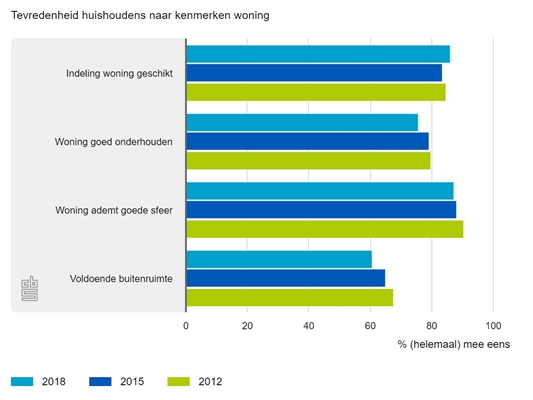 Van de huishoudens in een koopwoning liet 93 procent in 2018 weten tevreden te zijn met de woning, tegen 97 procent in 2006. In 2018 woonden ongeveer 4,5 miljoen huishoudens in een koopwoning, 2,1 miljoen in een sociale huurwoning en 910.000 in een particuliere huurwoning.