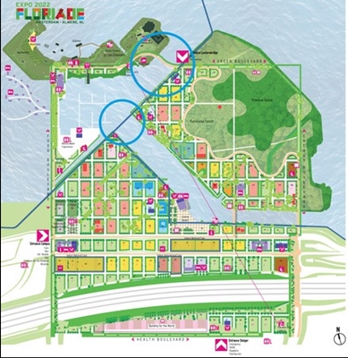 Floriadeterrein met de locatie van de twee bruggen omcirkeld