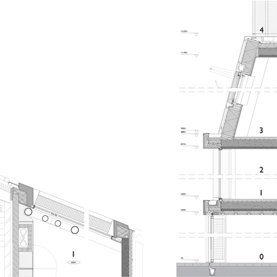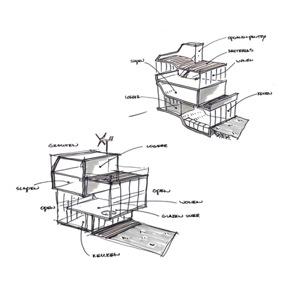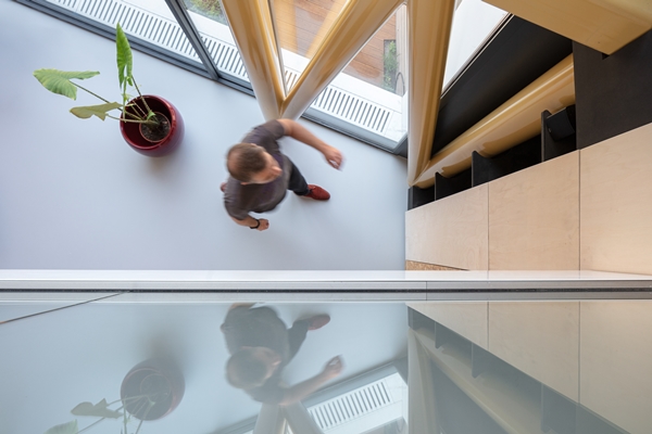 De slaapverdieping, die vanuit de woonruimte via open trappen bereikbaar is, is ontworpen als een gesloten kap. De bamboe gevelafwerking vormt visueel een geheel met het bovenliggende terras en de dakopbouw (met een pantry erin en zonnepanelen erop).