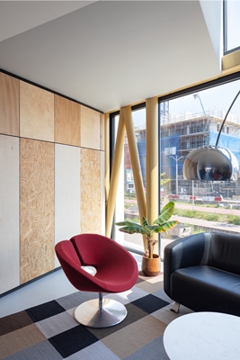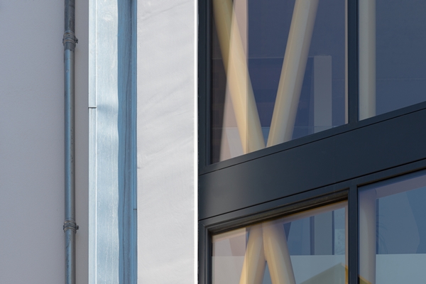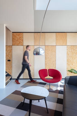 Prominent aanwezig in de woonruimte -en van buitenaf te zien- zijn de stalen spanten waarmee de dwarsstabiliteit van de woning wordt verkregen. Op elke verdieping van het huis is een kastenwand te vinden, die is afgewerkt met verschillende soorten plaatmateriaal. Naast bergruimte bevinden de installaties zich in deze wand.